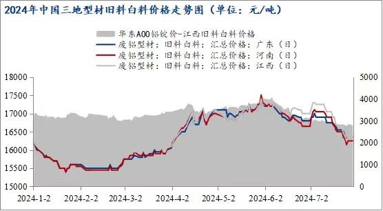 截止7月底,鋁價相對5月底高位時期下跌2800元/噸左右,下跌12.9%。而7月底再生鋁棒主要廢鋁原料之一的型材舊料白料價格在16250-16350元/噸,相比21700元/噸的鋁價高位時期,舊白料價格下跌1150-1200元/噸,下滑6.60%左右,廢鋁價格下跌幅度遠(yuǎn)不及鋁價。在鋁價持續(xù)回落的單邊行情下,廢鋁貨場來不及出貨,持續(xù)處于虧損狀態(tài)。受成本端支撐,貨場挺價惜售意愿較強(qiáng),市場上廢鋁流通量大幅減少,再生鋁棒企業(yè)采購困難,成本拉升。