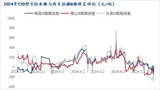 隨著鋁價的大幅回落,鋁水棒加工費也逐步回歸至往年中高位置。而再生鋁棒受廢鋁原材料高企制約,加上鋁價持續(xù)回落,企業(yè)長期處于虧損狀態(tài),再生鋁棒價格相比鋁水棒價格表現(xiàn)更加堅挺。就B棒而言,目前周均結(jié)算加工費在200-400元/噸,點價結(jié)算加工費在350-550元/噸,價格已趕超原生棒價格。7月份B棒精廢差在-300~100元/噸區(qū)間震蕩盤整,且長期處于負(fù)值,精廢差倒掛。在高生產(chǎn)成本下,企業(yè)不得不集體挺價保利接單,下游對目前價格接受度有限,多采購原生棒居多,再生鋁棒市場需求遇冷。